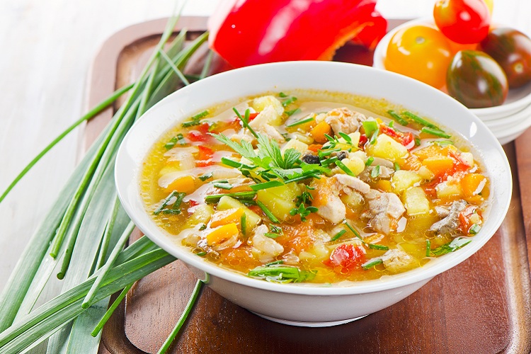 – Passado esse tempo, sua sopa de legumes com frango está prontinha para ser saboreada, bom apetite!